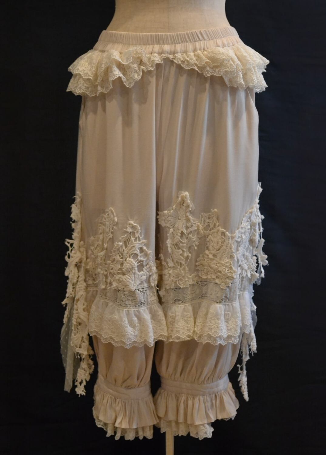 古着のドロワーズパンツにフランス製アンティークレースを手縫いした一着です。
