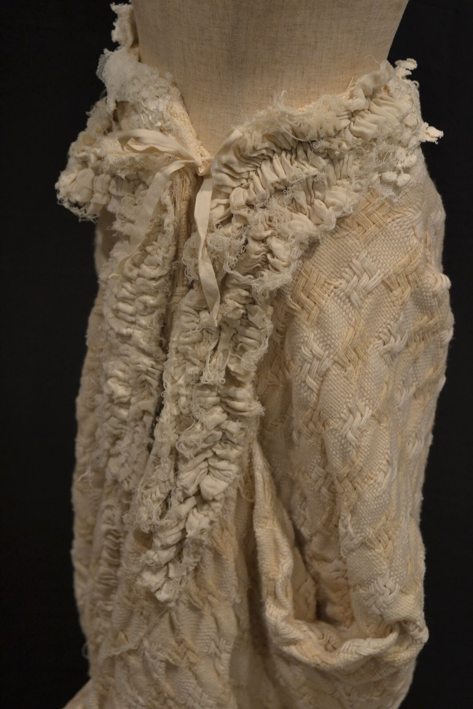 古着のケープにフランス製アンティークレースと古布で作ったフリルを手縫いで施した一着です。
